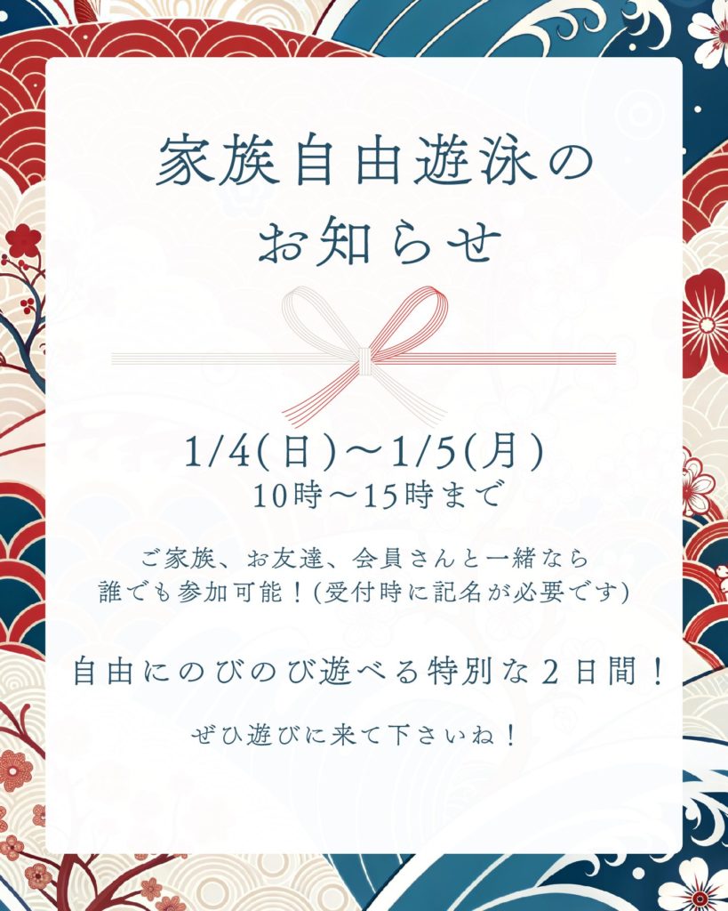 日時:1月4日(日)~1月5日(月) 10時~15時まで 自由遊泳日は、ご家族、お友達、会員さんと一緒なら誰でも参加可能です! (受付時に記名が必要になります。) 自由にのびのび遊べる特別な2日間! ぜひ遊びに来てください! 【年始の営業スケジュー... -